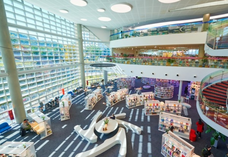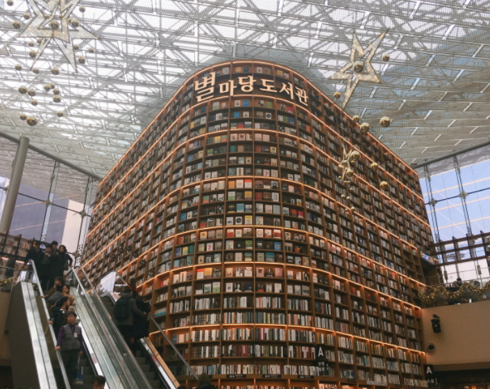 코엑스 센트럴플라자 중심에 별마당 도서관 위치해 있는데 총 2,800㎡ 복층으로 13m 높이 서가의 은은한 불빛이 공간 전체를 부드럽게 감싸는 편안한 서재를 컨셉으로 하여 다양한 테이블과 노트북 작업이 가능하게 콘센트가 마련되어 있습니다.