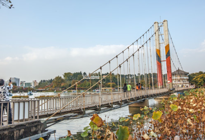 뎍진공원의 크기는 4만 5천평의 경내에는 남쪽으로 3분의 2를 차지하고 있는 연못과 북쪽의 보트장을 동서로 가로지른 현수교가 그 사이를 양분하고 있습니다.